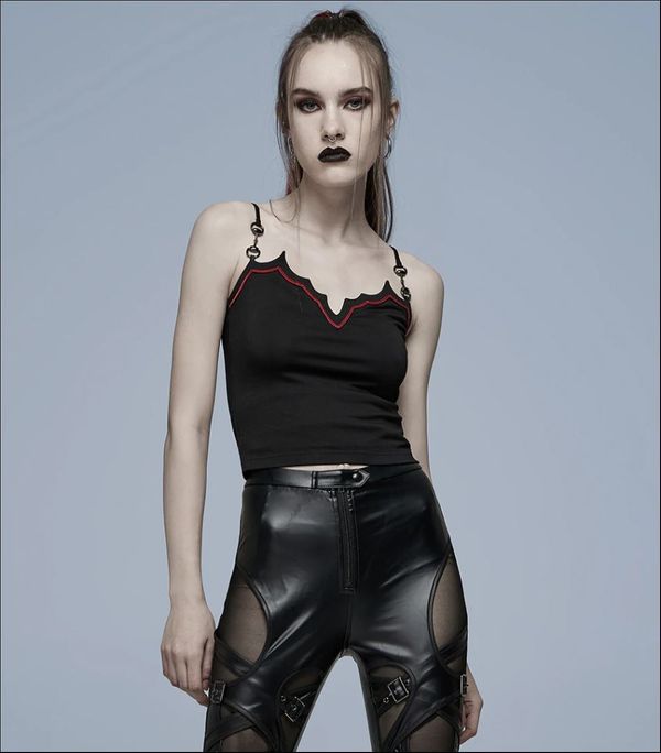 Voel je als bat girl met deze bat strap top van punkrave, ze heeft een V-hals met vleermuisvleugels en een bloedrode streep. Verstelbare bandjes met metalen lussen als extra detail, die zorgen voor een comfortabel draagcomfort. Als je dit combineert met killer newrock laarzen, shorts met hoge taille en visnet panty's, hou je het koel in de zomer.