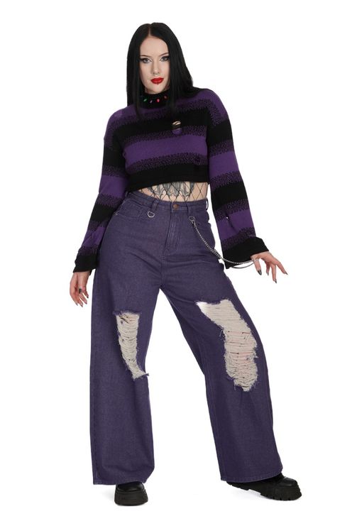 Candyfloss jumper purple/black Banned Zwart/paars zacht en stretchy gestreept. cropped model met hoge nek detail (coll) en bell sleeves Ripped detail StofL 60% viscose 40% katoen gebreid