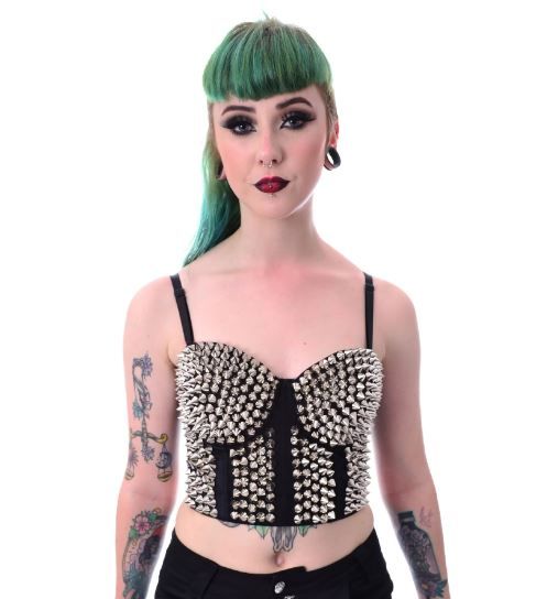Corset spike beha poizen industries. Beha top vol met (plastic) spikes. ideaal voor metal & punk minded dames elastische spaghettie bandjes . [34/75cm/BCup] haak sluiting achter 93% polyester 3% elastaan