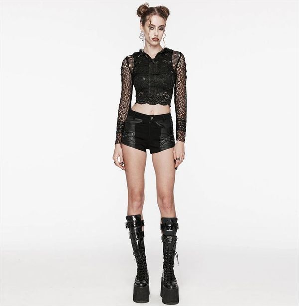 Punkrave jasje gemaakt van mesh en gebarsten kunstleer. Gescheurd ontwerp. ze heeft een capuchon. Studs en meerdere ooglussen versierd op de mouwen. Rits met skeletknoop voor het aan- en uittrekken. Getailleerd silhouet en licht elastische stof.