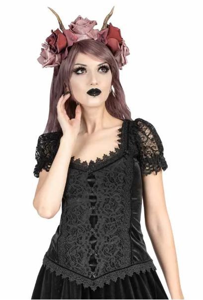 Victorian gothic-top met een diamanten halslijn en elastische pofmouwen van Siciliaans kant, versierd met een klein strikje van satijnen lint en rozenknop. Het voorpaneel van dit fluwelen lijfje dat de taille accentueert, is bedekt met twee panelen van gespiegeld Siciliaans kant en is versierd met brokaatkant en een fluwelen lint. Versierd met kleine satijnen strikjes en bloemen middenvoor. Ritssluiting aan de achterkant van de top.