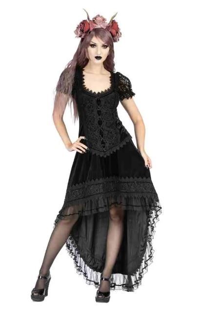 Zwart fluwelen gothic hoog-laag rok met een laagje Venetiaans kant, versierd met brokaatkant en een klein fluwelen lint langs de zoom. Aan de zoom van de rok zit een laag zachte mesh-ruches. De rok is versierd met kleine strikjes van satijnen lint en bloemen. Elastische tailleband met onzichtbare ritssluiting aan de zijkant.