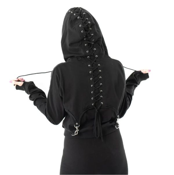Hoody in zwart katoen. rits voor met pentagram hanger en karabijn haken. Grote capuchon en rijgveter detail achter. extra lange mouwen Stof: 100% katoen.